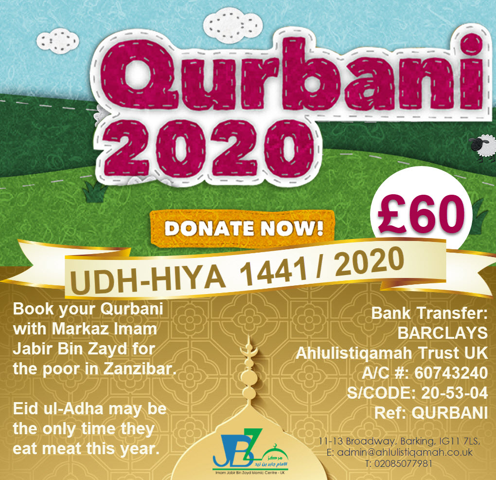 Jul 19 QURBANI £60 Posted in Announcement Book your Qurbani with Markaz Imam Jabir Bin Zayd for the poor in Zanzibar.